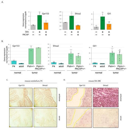 We found that the known HH target genes Gli1 and Gpr153, as well as our newly discovered HH target gene Shisa2, were upregulated in Shh-MB in the mouse. First, we compared the expression of putative Shh target genes in wild-type young (postnatal day 4; P4) and adult cerebella as well as two types of Shh-MB tumors—those derived from Ptch1+/− mice and those derived from mice heterozygous for both Ptch1 and Adcyap1 (double heterozygous; DHz) [15]. We found that all three putative HH target genes were expressed at higher levels in young highly proliferative cerebella compared to adult mature cerebella. All three were also strongly upregulated in murine Shh-MB tumors from Ptch1+/− and DHz mice (Figure 1B). These results were further confirmed using in situ hybridization (Figure 1C,D).