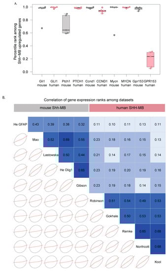 It has been shown that human and mouse Shh-MB tumors are distinct in terms of their gene expression profiles [13], but the conclusions of this study were based on a single microarray platform used for each species (HGU133 plus 2.0 for human, Mouse Genome 430 2.0 form mouse). To determine whether differences in gene expression between mouse and human Shh-MB are consistent independently of microarray methodology, we analyzed multiple datasets from GEO that had been generated on various microarray platforms for mouse and human (Table 1) [12,26,27,28,30,33]. We calculated differences between median log-transformed gene expression values for Shh-MB and the average median expression for all groups in each dataset. We then quantile-ranked genes that were represented in all microarray platforms based on these differences for each dataset (Table S1). As expected, known universal Shh target genes ranked near the top among genes upregulated in Shh-MB for all datasets, whereas Gpr153/GPR153 only ranked near the top in mouse datasets (Figure 3A). Overall, the ranks of Shh-MB gene expression changes were highly correlated among different human datasets and among different mouse datasets but were less well correlated between human and mouse datasets (Figure 3B) independently of microarray platforms and specific mouse Shh-MB models.