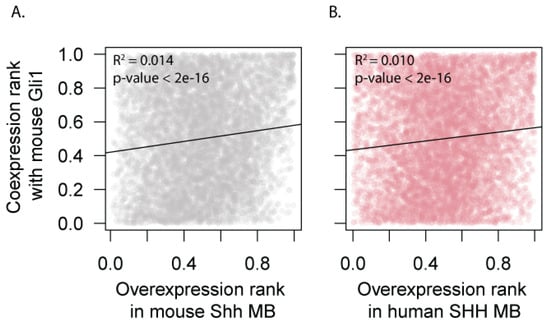 Mouse Hedgehog (HH) target genes are upregulated in both human and mouse Shh-MB. Genes were ranked according to their likelihood of being Shh targets in the mouse based on their coexpression patterns with the canonical Shh target Gli1 (y-axis) and ranked according to their overexpression in mouse Shh-MB (x-axis in A) or in human SHH-MB (x-axis in B). The rank R2 value is significantly different from 0 in both cases.