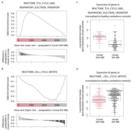 To determine what specific features of tumor pathophysiology determines the differences between mouse and human SHH-MB tumors, we ranked genes by differences between their overexpression values between human and mouse tumors, with highest positive values for genes that were highly upregulated in human SHH-MB tumors but downregulated in mouse Shh-MB tumors, and lowest negative values for genes that showed upregulation in mouse but downregulation in human SHH-MB. To determine what physiological processes were associated with the human but not mouse SHH-MB and vice versa, this list of genes was then fed into the Gene Set Enrichment Analysis (GSEA preranked) tool [21]. The results of GSEA point to genes associated with mitochondrial biogenesis and oxidative phosphorylation as those that, as a group, show the highest upregulation in human SHH-MB but are not upregulated in mouse Shh-MB (Table 2, Figure 5A,C). On the other hand, genes upregulated in mouse Shh-MB but not human SHH-MB are associated with active cell cycle and the Rb-E2F pathway (Table 3, Figure 5B,D).