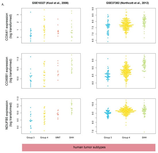 To check if transcriptomic gene expression measurements are reflected in protein expression levels, we performed immunohistochemistry on tissue sections from human MB tumors of different molecular subtypes resected at the Children’s Memorial Health Institute in Warsaw, Poland. In agreement with transcriptomic data, SHH-MB tended to be strongly positive for COX4, one of the mitochondrial respiratory chain markers, but only if the tumor was not immunoreactive for p53 (Figure 9A). Most p53-positive tumors in the SHH subgroup had low immunoreactivity for COX4. COX4 immunoreactivity in WNT subgroup tumors, as well as Group 3 and Group 4 tumors, was overall lower than in p53-negative SHH-MB (Figure 9C,D). Since strong immunoreactivity for p53 is often used as a surrogate marker for TP53 mutations [39], our data suggest that high expression of respiratory chain components is negatively correlated with mutations in TP53 in SHH-MB tumors. Interestingly, we also found very strong COX4 immunoreactivity in one sample of MBEN (medulloblastoma with extensive nodularity)-type SHH-MB in the internodular region of the tumor (Figure 9B).