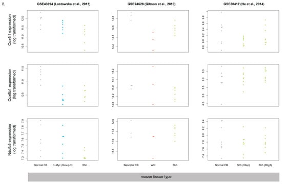 Of note, datasets containing gene expression for human samples do not contain healthy cerebellum controls, whereas all mouse datasets do contain healthy samples as controls. To ensure that the choice of controls does not affect analysis results, we repeated gene ranking using a recently published combined dataset of gene expression results from healthy cerebella and different medulloblastoma subtypes available from the GEO accession number GSE124814 [20]. The analysis was performed as follows. For each gene and each medulloblastoma subgroup or cerebellar control, a median log-transformed expression value was calculated. The cerebellum control medians were then subtracted from median log expression values for each medulloblastoma subgroup, which yielded cerebellum-normalized median log expression values, which were used for gene ranking. Similarly, for each mouse dataset, a median log-transformed expression was calculated for each gene and each medulloblastoma subgroup or cerebellar controls, and the cerebellum control median was subtracted from all other groups. Cerebellum-normalized median log expression values for Shh-MB were then averaged across mouse datasets and used for subsequent gene ranking.