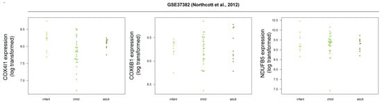 We then picked a few of the genes in the oxidative phosphorylation/respiratory electron transport category for a more detailed expression analysis in selected datasets. (Figure 6). The expression of these genes is increased in human SHH-MB tumors compared to the other subgroups and is either decreased or unchanged in mouse Shh-MB compared to normal adult or neonatal cerebellum. Because adult/childhood SHH-MB was found to be more similar to mouse Shh-MB models than SHH-MB in infants [13], we hypothesized that perhaps the increased expression of mitochondrial chain genes in human SHH-MB would only occur in infant SHH-MB, but not in the adult/childhood cases. However, we found no consistent significant differences in expression of these genes among different age groups of SHH-MB samples (Figure 7).