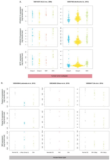 One of the ways cells regulate the balance of oxidative phosphorylation vs glycolysis is via so-called “master regulators” of mitochondrial biogenesis: PGC-1α and PGC-1β [37]. In melanoma, PGC-1α expression is in turn controlled via the transcription factor MITF [38]. To determine whether the MITF->PGC-1 axis may be involved in the increased expression of respiratory chain genes in human SHH-MB, we checked the expression of genes encoding these proteins (MITF, PPARGC1A, and PPARGC1B) in medulloblastoma transcriptomic datasets. Interestingly, all three factors are upregulated in human SHH-MB, but their murine homologs are not upregulated in mouse Shh-MB (Figure 8), suggesting that the increase in genes encoding respiratory chain proteins in human SHH-MB is due to the upregulation in master regulators of oxidative phosphorylation from the PGC-1 family, and their upstream regulator MITF.