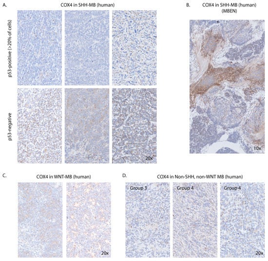 COX4 is highly expressed in a subset of human SHH-MB. Sections of FFPE tumor samples were stained with the anti-COX4 antibody (brown) and counterstained with hematoxylin (blue). Images were scanned at an original magnification of 40×. Digital magnification is 20× for all images except MBEN-type SHH-MB (B). (A) COX4 in primary SHH-MB tumors according to p53 status. (B) MBEN-type SHH-MB showing strong COX4 immunoreactivity in the internodular region imaged at 10× physical magnification. (C) WNT-MB tumors imaged at 20× physical magnification. (D) Non-SHH-, non-WNT-type tumors imaged at 20× magnification. The molecular subgroup is indicated for each sample.