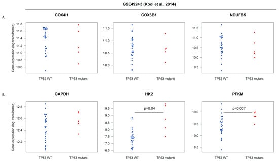 To check if TP53 mutations may be associated with lower expression of oxidative phosphorylation genes in SHH-MB, we analyzed a gene expression dataset for SHH-MB for which matched genomic DNA analysis is also available [7]. Out of 73 microarray-analyzed tumor samples, we could find matching information on TP53 mutations on 30 of these. Twenty-five were TP53 wild-type, and 5 had TP53 mutations, including 3 germline mutations, 1 somatic mutation, and 1 mutation where the origin was unknown. Although the expression of COX4I1, COX6A1, and NDUFB5 tended to be lower in TP53-mutated tumors (Figure 10A), the differences were not statistically significant. Glycolysis markers (GAPDH, HK2, PFKM), on the other hand, tended to be increased in TP53 mutant tumors with two of them (HK2 and PFKM) having statistically significantly higher expression in the TP53 mutant group (Figure 10B). We are hesitant to make strong conclusions from this data due to the limited sample size, but we believe that further analysis on a larger set of samples with matched genomic/transcriptomic data is warranted.