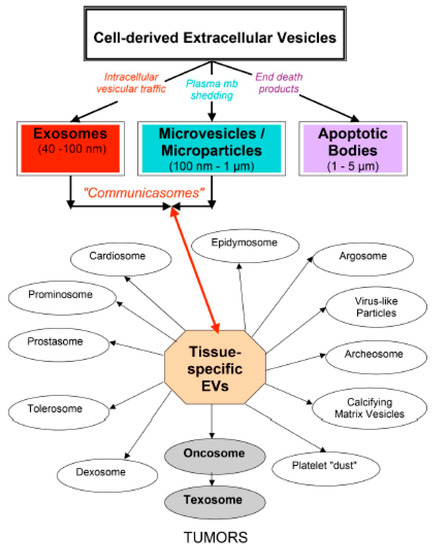 Cancer is by far the most studied human disease under the EV light. However, no unique cancer-specific pathway has yet emerged. Each of the most common human cancers behaves like a specific illness and develops its own panel of various tumor cells-derived EVs, with specific compositions and timely influences on the tumoral near or distant environment. Many papers are devoted to EVs with a given specific human cancer, but are out of the scope of this review. Each main EV class can be an actor implied in cancerogenesis, but its relative importance, compared with the ones of the other EVs classes can vary for different tumors. Microvesicles have important pathological roles as mediators of intercellular communication in cancer [71] and in tumor progression by novel microenvironment modulators [72], facilitating the spreading and release of cancer cells to generate metastases [67].