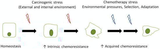 Development of intrinsic and acquired chemoresistance in the process of colorectal carcinogenesis. During malignant conversion, individual cells are exposed to carcinogenic events from external and internal environments, which prompt the gradual development of intrinsic chemoresistance to mediate cell survival. During advanced stages of carcinogenesis and upon exposure to chemotherapy-related stress combined with selection-adaptation-related pressures, malignant cells develop acquired chemoresistance.