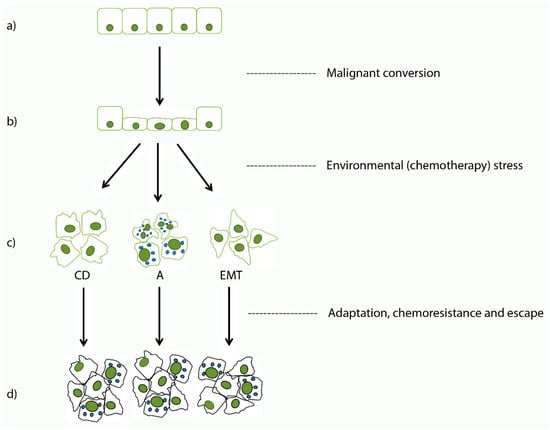 Selected phenotype malignant colorectal carcinoma cells develop to escape chemotherapy-dependent effects. Normal colonic epithelial cells (a) undergo malignant conversion (b) and upon exposure to various stresses (environment and/or chemotherapy-related) they became resistant to cell death (CD) or upregulate autophagy (A) or undergo epithelial-mesenchymal transition (EMT) to escape (c). The resulting surviving malignant cell populations are a heterogeneous mixture of cells with the mentioned phenotypes (d).