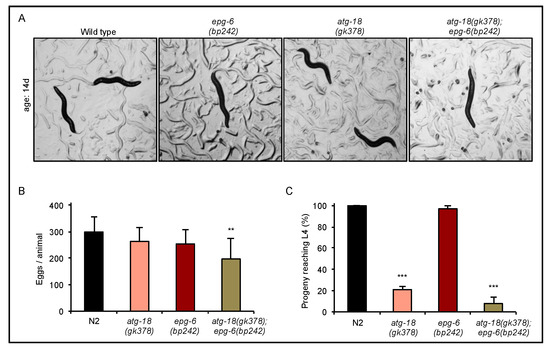 Viability and brood size decreased in the absence of functional autophagy related 18 (ATG-18). (A) Light microscopy images of Caenorhabditis elegans wild-type (N2), atg-18(gk378), epg-6(bp242), and atg-18(gk378);epg-6(bp242) strains were taken using a 1.2× objective and representative images are shown, n ≥ 9. (B) Single hermaphrodites were transferred to nematode growth medium (NGM) plates and the total number of eggs during the reproductive period per hermaphrodite was counted (n > 4). (C) The number of eggs hatching and reaching the larval stage 4 (L4)/adult stage was counted, and the percentages, based on the total egg number, was calculated. Mean values (+STDEV) of the number of eggs (B) and the brood size (C) are shown, and significant differences compared to wild-type indicated ** p < 0.01, *** p < 0.001, one-way ANOVA.