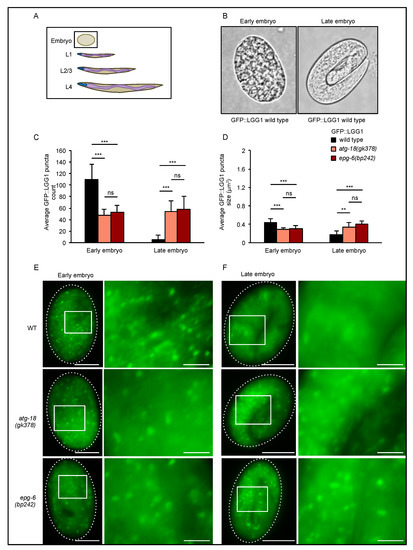 GFP::LGG-1 puncta formation decreased in early embryos, but enlarged puncta accumulate in late-stage embryos of atg-18 and epg-6 mutant animals. GFP::LGG-1 puncta formation was analyzed in wild-type, atg-18(gk378), and epg-6(bp242) embryos expressing the adIS2122 transgene. The scheme in (A) indicates the developmental stage where GFP::LGG-1 puncta assessments were conducted, and the images in (B) show early- and late-stage embryos as examples. Fluorescence microscopy images were quantified using the stress granule counter plugin of ImageJ. The average number (C) and the average size (D) of GFP::LGG-1 puncta were calculated and representative images are shown (E,F). Scale bar: 20 μm. Significances were calculated using the Kruskal–Wallis test, ns: not significant, ** p < 0.01, *** p < 0.001. For more information, see Data S1.