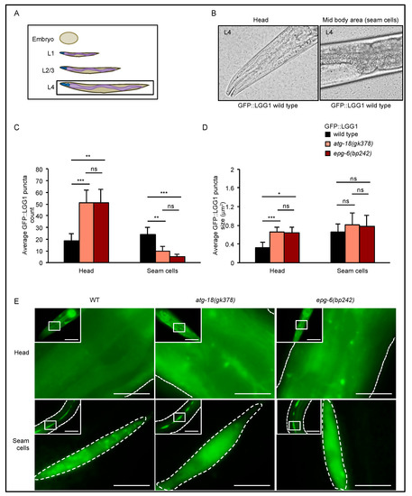 GFP::LGG-1 puncta accumulated in L4 larvae in the head but decreased in numbers in seam cells. GFP::LGG-1 puncta formation was analysed in the head and seam cells of wild-type, atg-18(gk378), and epg-6(bp242) L4 larvae expressing the adIS2122 transgene. The scheme in (A) indicates the developmental larval stage (L4) where GFP::LGG-1 puncta assessments were conducted, and the images in (B) show head and mid-body regions, the latter with seam cells, as examples. Fluorescence microscopy images were quantified using the stress granule counter plugin of ImageJ. The average number (C) and size (D) of GFP::LGG-1 puncta were calculated. Representative images are shown (E). Scale bar: 20 μm. Significances calculated using the Kruskal–Wallis test, ns: not significant, * p < 0.05, ** p < 0.01, *** p < 0.001. For more information, see Data S1.