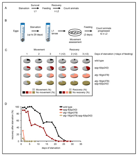 When C. elegans eggs hatch in the absence of food, L1 larvae enter an arrested stage, which wild-type larvae survive for up to three weeks and upon re-feeding they recover and develop further [21]. As proper autophagic activity is required for the survival of this starvation period [11,21,29], we aimed to further investigate the physiological roles of ATG-18 and EPG-6 in C. elegans by measuring the survival and recovery of L1 larvae upon starvation. (Figure 7). Following synchronization, L1 larvae (atg-18(gk378), epg-6(bp242), and atg-18(gk378);epg-6(bp242)) were continuously starved over a period between 1 to 29 days and their survival was assessed by counting larvae that recovered from starvation and progressed through larval stage L2 in the presence of food (Figure 7A,B).