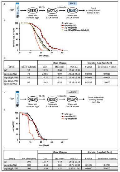 Lifespan increased in the absence of EPG-6. Synchronised animals were grown to L4 larval stage and transferred either to NGM E. coli OP50 plates supplemented with FUDR and counted every other day (A), or they were counted and transferred each day to fresh NGM/E. coli OP50 plates without fluorodeoxyuridine (FUDR) (D). The lifespans of wild-type, atg-18(gk378), epg-6(bp242), and atg-18(gk378);epg-6(bp242) worms were measured. Survival plot and statistical analysis of one representative set out of three independent experiments is shown (B,C,E,F). Statistical analysis was performed using basic survival analysis of the “Online Application for the Survival Analysis of Lifespan Assays Performed in Aging” software. For more information see Data S1.