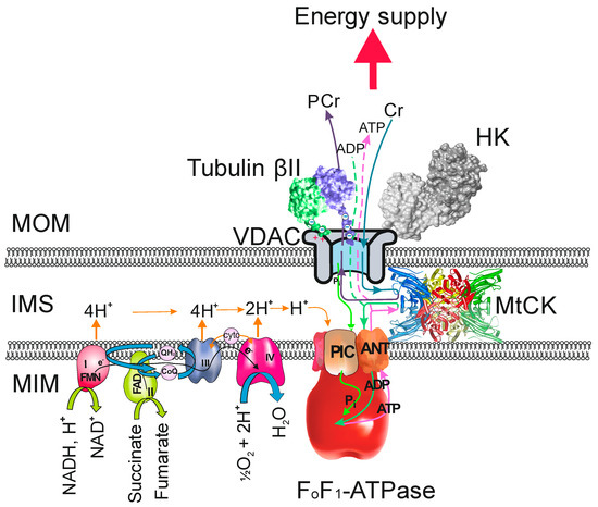 The Mitochondrial Interactosome (MI) and the role of tubulin in its regulation. In the MI of oxidative muscle cells the tubulin C-terminal tail interacts with the mitochondrial voltage-dependent anion channel (VDAC) and restricts the diffusion of adenine nucleotides ATP and ADP through the channel. Tubulin-VDAC interaction does not interfere with creatine (Cr) and phosphocreatine (PCr) movement in or out of the mitochondria. Creatine is phosphorylated in the mitochondrial intermembrane space (IMS) by mitochondrial creatine kinase (MtCK). As the MtCK is located close to the adenine nucleotide translocase (ANT), the ATP produced in the mitochondrial matrix is quickly directed to MtCK reaction and ADP is transported back to the matrix. Due to this VDAC-tubulin interaction the energy-rich phosphate is directed to the CK energy transfer network and MtCK has become an important regulator of the ATP synthasome (consisting of the FoF1-ATPase, respiratory chain complexes, inorganic phosphate carrier (PIC) and ANT). Hexokinase (HK) can also bind to VDAC. The main task of this interaction is to guide the ATP produced in mitochondria to be available for glycolysis. In MI of cancer cells MtCK probably does not participate in the regulation of oxidative phosphorylation. To what extent and how tubulin (supposedly βIII-tubulin) and HK compete for binding on VDAC needs further investigation. MOM—mitochondrial outer membrane; MIM—mitochondrial inner membrane.