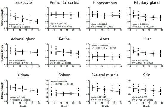 Telomere length was significantly decreased in leukocytes, hippocampus, pituitary gland, retina, liver, kidney, skeletal muscle, and skin (Figure 1). The telomere length decline rate compared to the two-month-old was highest in the leukocytes (–50% at 24 months) and the skeletal muscle (–33% at 24 months) (Figure 1).