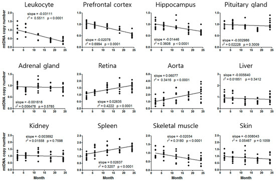 Aging standard curves for mitochondrial DNA copy number of C57BL/6 male mice. The relative mtDNAcn (analyzed by Cox2) at 2 months is normalized to 1. The slope of the linear regression line, goodness of fit (r2), and p-value (whether a slope is significantly non-zero) are provided for each curve.