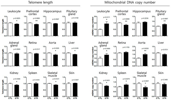 Chronic immobilization stress (CIS)-induced changes in telomere length and mitochondrial DNA copy number in 12 tissues. *, p < 0.05; **, p < 0.01 from unpaired Student’s t-test between control (CTL, n = 15) and stressed group (STR, n = 18).