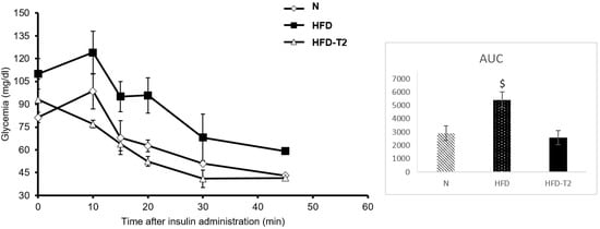 Insulin Tolerance test (ITT). Glycemia after insulin administration at different time points in N, HFD, and HFD + T2 rats. Area under the curve (AUC). Values are means ± SEM of five independent experiments (N = 5) $ p < 0.05 vs. N and HFD-T2. After 10 min from insulin injection, both N and HFD showed a small but not significant increase in glucose level, but this is not surprising and can happen frequently [49].