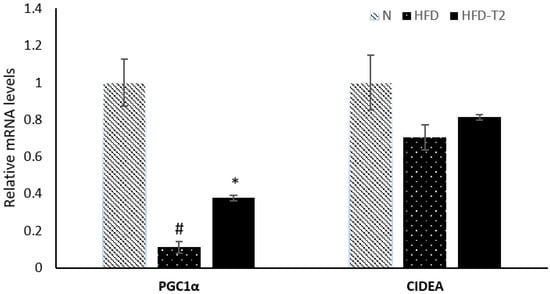 qPCR analysis of PGC1α and CIDEA in sWAT of N, HFD, and HFD-T2 rats. Values are means ± SEM of five independent experiments (N = 5), # p < 0.05 vs. N; * p < 0.05 vs. N-HFD.
