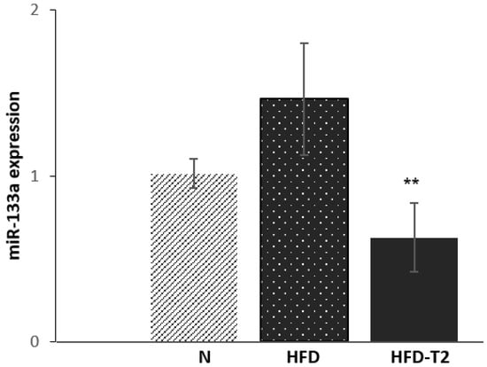qPCR analysis of miR-133a in sWAT of N, HFD, and HFD-T2 rats. Values are means ± SEM of five independent experiments (N = 5), ** p < 0.05 vs. N-HFD.