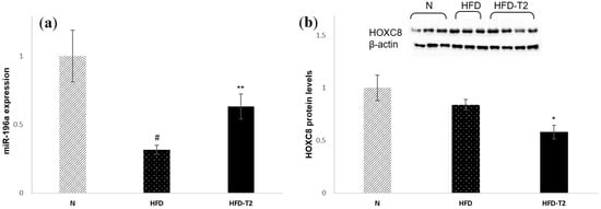 qPCR analysis of miR-196a in sWAT of N, HFD, and HFD-T2 rats. (a) qPCR analysis of miR-196a in sWAT of N, HFD, and HFD-T2 rats; (b) Immunoblots and densitometry showing relative expression of HOXC8 and β-actin in sWAT lysates. Values are means ± SEM of five independent experiments (N = 5), * p < 0.05 vs. N-HFD; ** p < 0.05 vs. HFD # p < 0.05 vs. N.