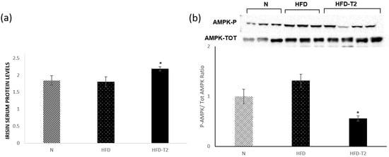 Finally, to verify if p38 can be triggered by an alternative pathway, involving, for example, the AMPK and TAB1/TAK1 complex [38,57] or Irisin [56], we measured the phosphorylation levels of AMPK and the serum levels of Irisin. Our data showed that Irisin serum levels were significantly increased in HFD+T2 rats (of about 30%) when compared to rats fed HFD (Figure 9a), while the phosphorylation levels of AMPK were reduced in the sWAT of HFD-T2 rats when compared to both N and HFD animals (Figure 9b).