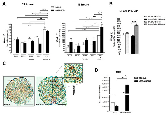Given these findings, we chose the 48 h treatment for further analysis. To further explore the effect of FM19G11-loaded NPs on epSPC proliferation, we analyzed the expression of telomerase reverse transcriptase (TERT) component through qRT PCR. We observed a significant increase in TERT mRNA levels in FM19G11-loaded NPs treated 12-week G93A-SOD1 epSPCs when compared to FM19G11-loaded NP treated B6.SJL epSPCs and to G93A-SOD1 epSPCs at basal levels (untreated) (Figure 1D). We also discovered a significant increase in TERT mRNA levels in FM19G11-loaded NP-treated 8-week B6.SJL and G93A-SOD1 epSPCs compared to untreated epSPC controls (Figure S1; p < 0.05). At 18 weeks, we failed to observe differences in TERT mRNA levels between treated and untreated cells in the two groups of animals (Figure S1).