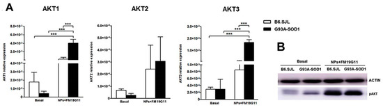 Analysis of AKT1-3 expression following FM19G11-loaded NP treatment (A) qRT PCR expression analysis of the AKT1, AKT2, and AKT3 genes in 12-week B6.SJL (white bars) and G93A-SOD1 (black bars) epSPCs after 48 h of FM19G11-loaded NP treatment compared to basal conditions. Expression levels reported as mean ± SD of 2−ΔCT values normalized against the endogenous control 18S (n = 5 different primary cell cultures from five animals per group). (B) Representative Western blot analysis of p-AKT and β-actin (n = 2 different primary cell cultures from two animals per group). *** p < 0.001 by ANOVA followed by Bonferroni post-hoc test.