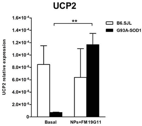FM19G11 treatment can induce the expression of mitochondrial genes and mitochondrial activity, thereby triggering an adaptive cellular response which increases ATP production [14]. For this reason, we investigated the expression levels of the UCP1 and UCP2 mitochondrial genes in B6.SJL and G93A-SOD1 epSPCs after 48 h of FM19G11-loaded NP treatment. We failed to observe any difference in UCP1 expression levels between treated and untreated cells in both groups of animals (data not shown); however, we did observe a significant increase of UCP2 mRNA levels in 12-week (Figure 4; p < 0.01) and 8-week (Figure S4; p < 0.05), but not 18-week G93A-SOD1 epSPCs (Figure S4) following FM19G11-loaded NP treatment.