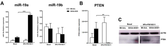 We next explored the expression levels of phosphatase and tensin homolog (PTEN), a gene target of miR-19a involved in the proliferation and self-renewal of epSPCs [11]. Notably, in 12-week G93A-SOD1 epSPCs, PTEN expression displayed an opposite trend compared to miR-19a. Indeed, PTEN transcript levels were significantly down-regulated in these epSPCs after treatment with FM19G11-loaded NPs (Figure 5B; p < 0.01). In 8- and 18-week epSPCs, we failed to observe a significant difference in PTEN expression between treated and untreated cells (Figure S5). In line with our mRNA data, Western blot analysis established a decrease in PTEN protein expression in treated 12-week G93A-SOD1 epSPCs when compared to basal conditions (Figure 5C). Of note, these results correlate well with those found for AKT expression, as PTEN negatively regulates AKT [23]. However, we did not find a decrease in PTEN levels in 12- (Figure 5B,C) or 18-week (Figure S5) B6.SJL epSPCs. This differential response could derive from the differential expression of miR-9, a known regulator of PTEN expression, previously reported by our group to be overexpressed in G93A-SOD1 epSPCs in comparison to B6.SJL epSPCs [11].