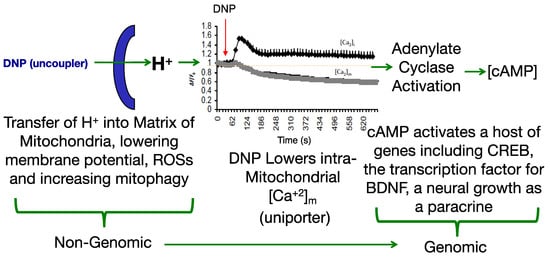 Non-genomic to Genomic Effects of 2,4-Dinitrophenol (DNP). The early immediate effects of DNP lower the mitochondrial membrane potential, which abolishes overt reactive oxygen species (ROS) production and subsequently closes the uniporter involved in calcium influx [28,29,30]. This event is considered “non-genomic” since the target is a location, the mitochondrial matrix, vs. a protein, receptor or gene. However, this effect increases cyclic adenosine monophosphate (cAMP) (2nd messenger), likely through activation of adenylate cyclase. The production of cAMP transitions the non-genomic event into a genomic event and induction of expression of a host of genes, both up-regulated and down-regulated. In particular, the DNP → cAMP → cAMP response element binding (CREB) → Brain-derived neurotrophic factor (BDNF) cascade lends itself to the possibility of increased cognition [30,31,32]. Calcium graph was adapted from Liu, et al. 2015 [30].