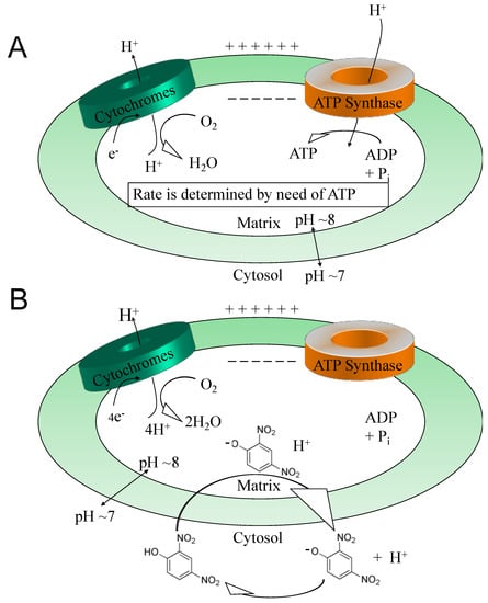 Coupling vs. uncoupling. Maintaining the proton gradient across the mitochondrial matrix and cytosol involves the pumping of protons out of the matrix via cytochromes I, III and IV. (A) The coupling of a proton (hydrogen or H+) transfer to the synthesis of ATP is a result of H+ returning through ATP synthase, causing rotation and subsequent phosphorylation of ADP, thereby yielding an ATP molecule. (B) This mechanism is circumvented in the case of chemical uncoupling (i.e., entry of protons without phosphorylation to produce ATP). The proton transfer into the matrix is on a carrier, a weak acid molecule (i.e., 2,4-dinitrophenol) with a unique dissociable proton (H+) due to the two NO2 “electron withdrawing” groups. Outside of the mitochondria in the acidic environment of the cytosol, DNP is in the protonated neutral form, but attracted to the basic environment of the matrix. Upon entering the matrix, DNP releases the dissociable proton (H+). Now in the negatively charged anionic form, DNP is attracted to the acidic environment of the cytosolic space, therefore returning to the cytosol to become reprotonated and the cycle starts over again. All mitochondrial systems remain functional but are accelerated. Reprinted by permission from Springer, Diabetologia (2011) 54:237–244, Targeting Energy Expenditure via Fuel Switching and Beyond, J.G. Geisler [2].