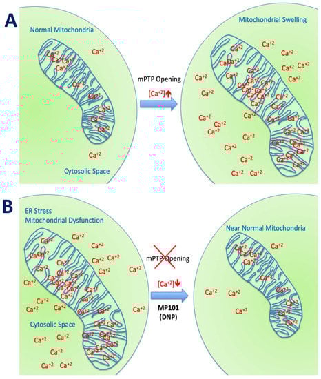 Calcium overload and DNP. (A) The cytosolic Ca2+ under normal conditions is kept low and released from the mitochondria for signaling [1]. However, for conditions related to unfolded protein response (UPR) that lead to ER stress such as Huntington Disease [41,42] or mutations directly of ER function such as Wolfram Syndrome [43] or loss of dystrophin in the case of Duchenne Muscular Dystrophy [44], calcium levels rise in the cytosol and subsequently in the mitochondria. If the threshold for mitochondrial Ca2+ storage is exceeded, the mitochondrial permeability transition pore (mPTP) is formed and the mitochondria are destroyed setting up a cascade for neighboring mitochondrial destruction [16]. (B) Calcium overload of the mitochondria may be reduced, even in the presence of a sudden rise of cytosol Ca2+ from the ER, in TBI and other conditions of metabolic stress, in the presence of DNP by closing the calcium uniporter channel. Reduced intra-mitochondrial calcium removes the driving force toward apoptosis, thereby saving the neuron, myotube and other at-risk cell types.
