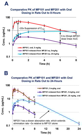 Comparative Oral PK in Rats of MP101 (DNP) vs. MP201 (prodrug of DNP). Male Sprague-Dawley rats (weighing 250–300 g) were housed three per cage with ad libitum access to food and water in the Division of Laboratory Animal Resources, UAMS. Femoral vein-catheterized rats, were treated with MP201 at a single oral dose (N = 4/dose) of 8, 40 and 80 mg/kg (equivalent to 5, 25 and 50 mg/kg of MP101, respectively due to the extra molecular weight) or DNP at 5 mg/kg. Blood samples (0.15 mL) were collected at 0, 5, 15, 30, 45, 60, 120, 240 and 480 min. Plasma samples were prepared and analysis was run using LC/MS/MS spectrometry. (A) MP101 (DNP) at 5 mg/kg shows a quick rise and a high Cmax relative the same equivalent dose at 5 mg/kg of MP201 (adjusting for additional molecular weight). Data shown is MP201’s release of DNP upon cleavage of prodrug linker to an active form (MP101/DNP) with a ~20× suppression of Cmax compared to MP101. In addition, MP201 has a dose linear AUC going from 5 to 25 mg/kg. (B) In compensation for the lower Cmax relative to MP101, MP201 has a much longer elimination phase (~3×) extending the AUC significantly for a “trickle-like” effect delivering DNP (unpublished). *Below the limits of detection at 24-h time-point of 10 ng/mL.