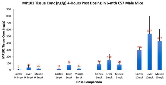MP101 (DNP) tissue concentrations (ng/g) in mice. Six-month aged male C57/bl6 mice were fasted for 4-h and then provided MP101 at a dose of 0.5, 1, 5 and 10 mg/kg (Mitochon sponsored study conducted at Melior Discovery (Exton, PA, USA)). Four hours later, the cortex, liver and skeletal muscles were harvested to determine tissue penetration levels by LC/MS at Keystone Bioanalytical (North Wales, PA, USA). The brain levels were generally slightly lower than muscle, which was less than the liver (unpublished).