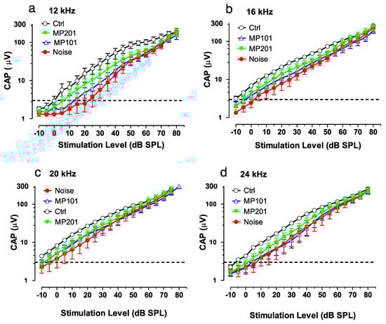 MP101 and MP201 are protective for hearing loss due to noise trauma. The compound action potential (CAP) amplitude is plotted on a logarithmic on the y-axis with the intensity of noise (decibels) on the x-axis. The CAP input/output functions are shown at (a) 12, (b) 16, (c) 20 and (d) 24 kHz. The data indicate that the CAP amplitudes were larger (better) in the noise-exposed groups that received MP201, versus the Noise alone group and statistically significant at 16, 20 and 24 kHz (p-value < 0.0001), but not 12 kHz (unpublished). Repeat measures by ANOVA.