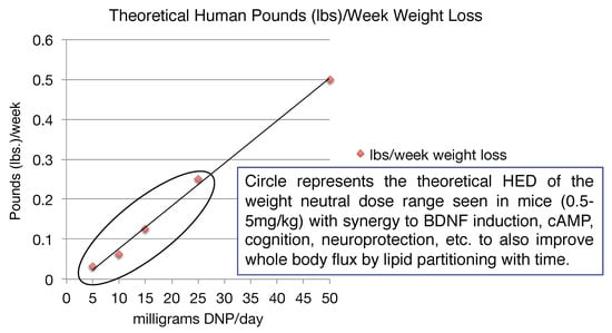 Although a lower ATP pool could be detrimental in the short term, it is noteworthy, at 3-days of dosing rats with DNP at 16 mg/kg (HED of 150 mg/day) there was no measurable change in intrahepatic ATP content (ATP pool), as assessed by 31P magnetic resonance spectroscopy [45]. It is known that for some diseases, ATP production is low and ROS production is high, which is usually associated with the lower membrane potentials found in dysfunctional mitochondria [44,46,47]. Since DNP lowers the membrane potential, there is a theory that it might selectively push those already marginally functioning mitochondria into mitophagy to shift the global mitochondrial population towards better functioning high ATP producers and lower ROS producers [48]. Additionally, it was shown that 3-days of mitochondrial uncoupling, induced by low concentrations of dinitrophenol (10 and 50 μM) in cultured human HepG2 cells, that there is an adaptive effect in that DNP towards oxidative metabolism, with an upregulation of COXIV and ANT3 gene expression, two nuclear genes that encode mitochondrial proteins involved in oxidative phosphorylation [49]. Glucose consumption, lactate and pyruvate production and growth rate were unaffected, indicating that metabolic adaptation of HepG2 cells undergoing chronic respiratory uncoupling allows continuous and efficient mitochondrial ATP production without the need to increase glycolytic activity. So collectively, it is possible that the net outcome is a higher ATP pool through more efficient mitochondrial functioning under chronic DNP treatment, than could previously be generated without the uncoupler.