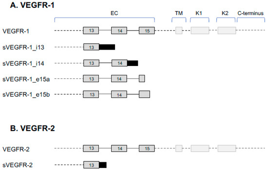 Alternative splice variants of VEGFR-1 and VEGFR-2. (A) Alternative splicing gives rise to five known splice variants of VEGFR-1: full length VEGFR-1, intron 13 retention (sVEGFR-1_i13), intron 14 retention (sVEGFR-1_i14), terminal exon 15a (sVEGFR-1_e15a), and terminal exon 15b (sVEGFR-1_e15b). The soluble isoforms only contain the extracellular (EC) domain and are missing the transmembrane (TM) and kinase (K1 and K2) domains. (B) Alternative splicing gives rise to two known splice variants of VEGFR-2: full length VEGFR-2 and sVEGFR-2, which result from intron 13 retention. The sVEGFR-2 only contains the EC domain.