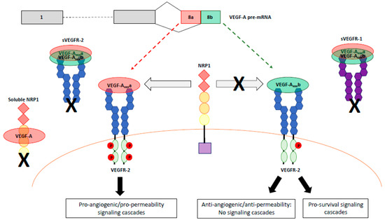 The human VEGF-A pre-mRNA consists of eight exons and seven introns. Alternative splicing of the VEGF-A pre-mRNA gives rise to a family of isoforms with a differing number of amino acids due to the exclusion/inclusion of various exons (e.g., VEGF-A121, VEGF-A165, VEGF-A189, and VEGF-A206, collectively known as VEGF-Axxxa where xxx denotes the number of amino acids) (Figure 2). Such isoforms are widely known to be pro-angiogenic, pro-permeability factors. In addition, the selection of an alternative 3′ splice site, known as the distal splice site, in exon 8 of the VEGF-A pre-mRNA results in a new family of VEGF-A isoforms, termed VEGF-Axxxb [28]. The resulting VEGF-Axxxb proteins differ in the C-terminal sequence by only six amino acids, resulting in radically different functional properties (Figure 2). In comparison to VEGF-Axxx, VEGF-Axxxb isoforms are collectively anti-angiogenic and reduce vessel permeability (anti-permeability). Sixteen isoforms of VEGF-A have been identified, including an additional isoform, VEGF-Ax, which arises from translational read-through of the VEGF-A transcript beyond the canonical stop codon (programmed translational read-through) [29].