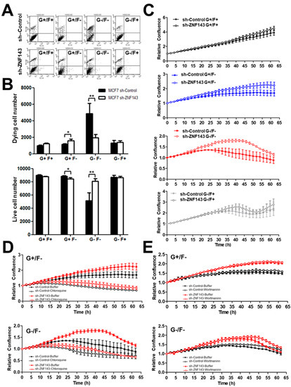 As a tumor grows, cells within the tumor mass are exposed to various cellular stresses, such as hypoxia, acidosis, and metabolic stress [30]. Here, we first investigated if MCF7 breast cancer cells showed a difference in cell survival when cells were stressed, depending on ZNF143 expression. Growing cells were exposed to nutrient deprivation for 24 h and viable cells were quantified by fluorescence-activated cell sorting (FACS) after propidium iodide (PI) staining (Figure 1A,B). Among 10,000 events, the number of PI positive, dying cells was much lower in MCF7 sh-ZNF143 cells than in MCF7 sh-Control cells when the cells were exposed to glucose-free or FBS-free media for 48 h. To confirm the ZNF143 knockdown effect on cell survival under metabolic stress, cells were grown on 96-well plates for 24 h, then were exposed to nutrient-deprived media, and were monitored using the IncuCyte ZOOM® System. Cell confluency was monitored by capturing images every 2 h for 3 days, then the data were automatically quantitated. MCF7 sh-Control and MCF7 sh-ZNF143 cells showed similar growth up to 3 days in growing media as we previously described [22], while starved cells without FBS or glucose, or both deprived media, showed less growth or survival of sh-Control cells than that of sh-ZNF143 cells (Figure 1C). The ZNF143 knockdown effect on cell survival reached a maximum in FBS-free and glucose-free media, which was reversed by chloroquine, an autophagic flux inhibitor (Figure 1D), but not by Wortmannin, an inhibitor for phosphoinositide 3-kinase (PI3-kinase) (Figure 1E). Because chloroquine inhibits autophagy by increasing lysosome pH [10,31], the ZNF143 knockdown effect on cell survival might result from the autophagic process, downstream of PI3-kinase.