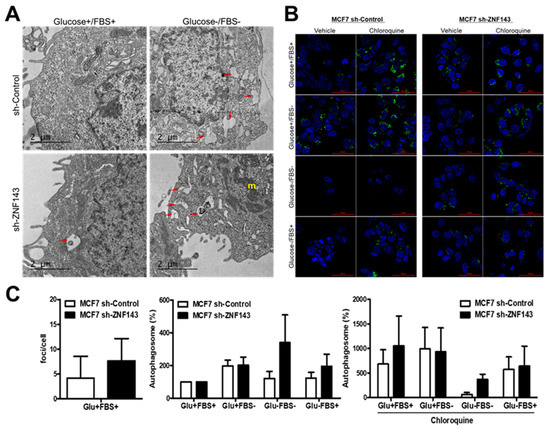 To further support the autophagic process during cell survival under metabolic stress, MCF7 sh-Control and MCF7 sh-ZNF143 cells were analyzed by TEM (Figure 2A). Numerous autophagic vacuoles were observed in MCF7 sh-ZNF143 cells versus sh-Control cells in growing condition. More active organelles and active autophagic flux were shown in MCF7 sh-ZNF143 cells than in sh-Control cells when cells were starved in FBS-free and glucose-free media implying the effect of ZNF143 knockdown for cell survival. To examine whether ZNF143 knockdown affected the autophagic process, cells were stained with CYTO-ID® (Enzo Life Sciences) before fixation, which measured autophagic vacuoles and monitored autophagic flux [25]. Growing cells were exposed to nutrient deprivation for 24 h in the presence or absence of chloroquine and were then stained with CYTO-ID® and fixed for imaging by confocal microscopy, followed by quantitation of foci (Figure 2B,C). Notably, more foci were observed in sh-ZNF143 cells than in sh-Control cells, similar to the TEM data, implying a relationship between ZNF143 and the autophagic process in breast cancer cells.