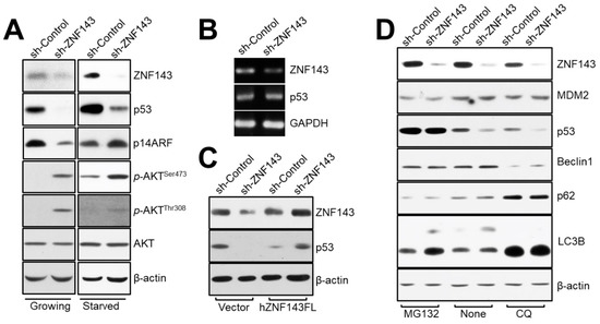 There are several ways proteins can be degraded, including the involvement of proteasomes and lysosomes. Specific short-lived proteins have been shown to be degraded through the 20S proteasome, but not the 26S proteasome, which did not require polyubiquitination for processing [37]. NQO1, as a gatekeeper for the 20S proteasome, has been shown to form a ternary complex with the 20S proteasome and p53, in the presence of NADH [37]. When we characterized the effect of MG132, an inhibitor for proteasomal degradation, on p53 stability in MCF7 sh-ZNF143 cells, we determined that p53 ubiquitination might not be the main mechanism for degradation in cells under ZNF143 knockdown conditions. Enhanced autophagy has been shown to improve the survival of p53-deficient cancer cells under stressful conditions, including nutrient depletion [48], supporting a p53 defect in autophagy, as supported by the data shown in Figure 4. To understand the balancing mechanism between autophagy and proteasome for tumor cell survival, and to apply the mechanism for anticancer therapy, additional studies are now being conducted.