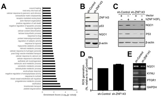 To explain how p53 is degraded in a proteasome-dependent manner in MCF7 sh-ZNF143 cells and how ZNF143 expression is linked to proteasome regulation through p53 in breast cancer cells, we conducted mass spectrometry to profile and identify differentially expressed proteins in MCF7 sh-Control and sh-ZNF143 cells (NCC Omicscore). Almost 5000 proteins were profiled, and 177 proteins were selected based on altered ZNF143 expression (more than 1.2-fold or less than 0.83-fold in sh-ZNF143 cells compared to that in sh-Control controls, with a significant p-value), and were used for pathway analysis in breast cancer cells (Figure 5A and Supplementary Table S2). Because ZNF143 has been identified as a transcription activating factor for the selenocysteine tRNA gene [12], and is involved in regulating reactive oxygen species (ROS) in cells by glutathione peroxidase 1 (GPX1) expression [16], pathways for “cellular oxidant detoxification”, “cellular response to hydrogen peroxide”, and “xenobiotic metabolic process and response to nutrient” led us to link some proteins of the 177 altered protein pool to ZNF143 in terms of redox regulation and p53 (Figure 5A). NAD(P)H-quinone oxidoreductase 1(NQO1), an enzyme that catalyzes the two electron-reductions of various quinones with NADH or NADPH as an electron donor [35], was listed (Supplementary Table S2). NQO1 has been reported to play roles in regulating p53 stability in a ubiquitination-independent mechanism [36,37]. Nuclear factor (erythroid-derived 2)-like 2(NRF2) has shown to be involved in NQO1 expression in redox sensitive manner [38,39]. We therefore hypothesized that NQO1 was a ROS-dependent regulator of p53 during the knockdown of ZNF143. We examined protein levels of NQO1 in MCF7 sh-Control and sh-ZNF143 cells (Figure 5B). NQO1 was downregulated by ZNF143 knockdown, and recovered when ZNF143 expression recovered, implying a role for ZNF143 in NQO1 expression (Figure 5C). In addition, ZNF143 knockdown significantly increased cellular ROS levels (Figure 5D), showing an altered equilibrium for ROS during ZNF143 knockdown. Furthermore, we found prostaglandin reductase 1 (PTGR1) and kynureninase (KYNU), targets of NRF2 [40,41], among the listed proteins from profiling (Supplementary Table S2) and observed altered expression of PTGR1 and KYNU in MCF7 cells expressing less ZNF143 (Figure 5E), supporting a role of ZNF143 in the oxidative stress–NRF2 pathway.