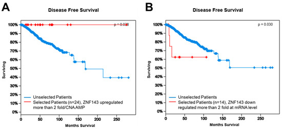 ZNF143 expression is related to disease-free survival of breast cancer patients according to TCGA. (A) Higher levels of ZNF143 mRNA expression and copy number alterations were associated with increased disease-free survival in the TCGA cohort. The log-rank value was 0.038. Patients with higher levels of ZNF143 gene expression are shown in red and patients without higher levels of ZNF143 gene expression are shown in blue. (B) Lower levels of ZNF143 mRNA expression were associated with decreased disease-free survival in the TCGA cohort. The log-rank value was 0.030. Patients with lower levels of ZNF143 gene expression are shown in red and patients without lower levels of ZNF143 gene expression are shown in blue. In all analyses, patients not applicable for any of the selected attribute(s) were excluded.