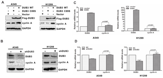 Growing evidence shows a strong link between cyclin A overexpression and NSCLC [17,18]. To clarify the potential mechanism by which DUB3 promotes the proliferation and tumorigenesis of NSCLC, we examined whether DUB3 would affect the levels of cyclin A. DUB3 was introduced into A549 and H1299 cells. Intriguingly, DUB3 overexpression significantly increased the endogenous cyclin A levels compared with the vector control (Figure 1A). By contrast, overexpression of a catalytically inactive DUB3 mutant (C89S) had no effect on cyclin A levels (Figure 1A), indicating that DUB3-mediated upregulation of cyclin A depends on the function of DUB3 as a deubiquitinating enzyme. To further valid the effect of DUB3 on cyclin A, we performed a loss-of-function analysis using DUB3-specific short hairpin RNAs (shRNAs) in A549 and H1299 cells. As predicted, DUB3 knockdown dramatically decreased the cyclin A levels (Figure 1B). Similar results were obtained using DUB3-specific interfering RNAs (siRNAs) in A549 and H1299 cells (Figure S1A).