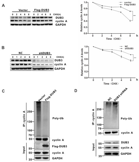 Since DUB3 prevents cyclin A from proteasome-mediated degradation, we hypothesized that DUB3 might affected cyclin A protein stability. To address this, A549 cells transfected with or without DUB3 were treated with cycloheximide (CHX) to inhibit protein biosynthesis, and protein extracts obtained at indicated time points were analyzed. As shown in Figure 4A, overexpression of DUB3 significantly prolonged the half-life of endogenous cyclin A. By contrast, in cells depleted of DUB3, the half-life of cyclin A was significantly decreased (Figure 4B and Figure S3A), indicating that DUB3 regulates the stability of cyclin A protein.