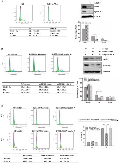 Anti-DUB3 (cat. #PA5-44961) antibody was purchased from Invitrogen (Waltham, MA, USA). Anti-cyclin A (cat.ab38) antibody was from Abcam (Cambridge, England). Anti-Ub (cat. 550944) and anti-cyclin A (cat.554174) antibodies were from BD Biosciences (Franklin Lakes, NJ, USA). Anti-Flag (cat. M185-3L) antibody was from MBL (Tokyo, Japan). Anti-GAPDH (cat.AT0002) antibody was from Cmctag (Milwaukee, WI, USA).