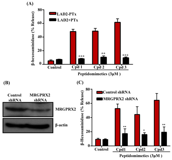 To determine if the effects of these compounds are mediated via the activation of Gαi family of G proteins, we incubated cells with pertussis toxin (PTx). As shown in Figure 2A, degranulation in response to all three compounds was substantially inhibited by PTx, indicating the involvement of G proteins. HDPs induce degranulation in human MCs via MRGPRX2 [20,23,28]. To determine if these compounds also activate human MCs via MRGPRX2, we silenced its expression in LAD2 cells with lentiviral shRNA. Compared to the control-shRNA transduction, MRGPRX2-shRNA transduction resulted in a substantial reduction of MRGPRX2 expression as demonstrated by Western blotting (Figure 2B). Furthermore, degranulation induced by all three compounds was significantly inhibited in MRGPRX2-silenced cells when compared to control shRNA transduced cells (Figure 2C). RBL-2H3 is a rodent MC line that has been used to study IgE-mediated responses in vitro. Unlike LAD2 cells, it does not express MRGPRX2 and is unresponsive to its ligands. We therefore used RBL-2H3 cells stably expressing MRGPRX2 to confirm the role of this receptor on smHDPM-induced responses in MCs. As shown in Figure 3A, all compounds (3 µM) induced 40–50% degranulation in MRGPRX2-expressing cells but not in untransfected cells. RBL-2H3 cells expressing MRGPRX2 were used to determine the EC50 value for the smHDPMs. The EC50 values were 0.8 µM, 3 µM, and 1.8 µM for Compound 1, 2, and 3, respectively (Figure 3B–D).