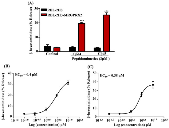 Compound 4 and Compound 5 induce degranulation in RBL-2H3 cells expressing MRGPRX2. (A) Untransfected RBL-2H3 cells (RBL-2H3) and cells stably expressing MRGPRX2 (RBL-2H3-MRGPRX2) were exposed to vehicle (Control), smHDPMs compound (Cpd) 4, and Cpd 5 (3 µM each) for 30 min and percentage of β-hexosaminidase release was determined. Concentration–response curves for (B) Cpd 4 and (C) Cpd 5 were performed using RBL-2H3-MRGPRX2 cells. Data are presented as mean ± SEM and are representative of three independent experiments in triplicate. Statistical significance was determined by two-tailed unpaired t-Test. *** indicates p value <0.001.